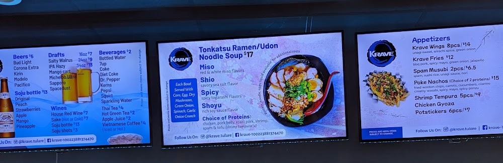 Krave offers a diverse menu, catering to various tastes and dietary needs. The ramen section features options such as Tonkatsu and Udon, with prices averaging $18.50. Each bowl is rich, savory, and inviting, perfect for ramen enthusiasts.